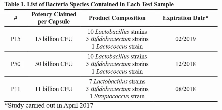Three commercial probiotic products were selected for investigation. The products are summarized below.