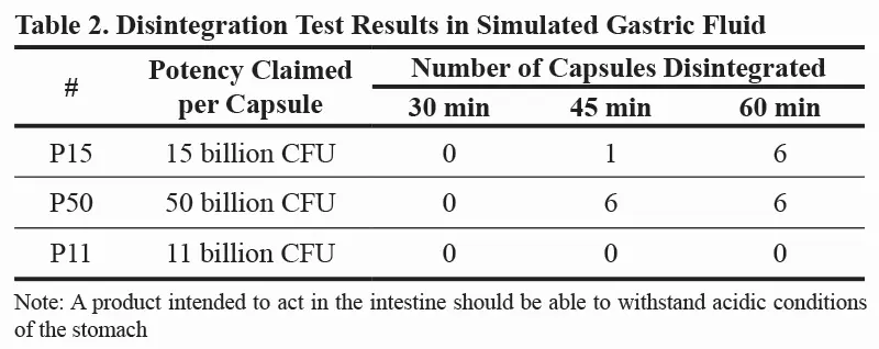 Three commercial probiotic products containing primarily Lactobacillus and Bifidobacterium species were investigated. They were identified as P15, P50, and P11. All three products are encapsulated in vegetable-sourced capsules, with P11 being enteric-coated. The objective of this study was to evaluate capsule disintegration and microbial survival of probiotic strains upon exposure to simulated gastric conditions. Capsule disintegration was performed respecting the protocol of the United States Pharmacopoeia (USP).