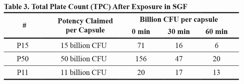 Probiotic samples were incubated for defined periods of time in a simulated gastric environment, then neutralized and plated on a suitable culture media. After 60 minutes,