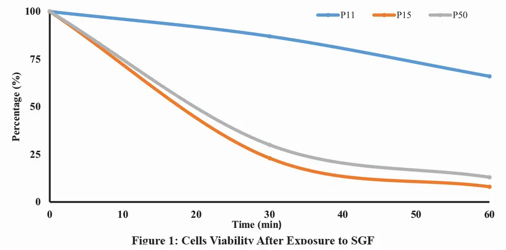 This illustration provides evidence of the impact of acidic conditions on probiotics. P15 and P50 exhibited 8% and 13% viable cells, respectively, versus 66% for P11 (Fig. 1) following 60 minutes of incubation. After 30 min, this viability was calculated to be 23%, 30%, and 87 % for P15, P50, and P11, respectively. These results show that Lactobacillus and Bifidobacterium species are sensitive to acidic conditions. These bacteria inhabit human intestines where the pH is neutral, between 6 and 7.5 (Maurer, J.M. et al, 2015). This demonstrates the critical importance of enteric coating for delayed release dosage.