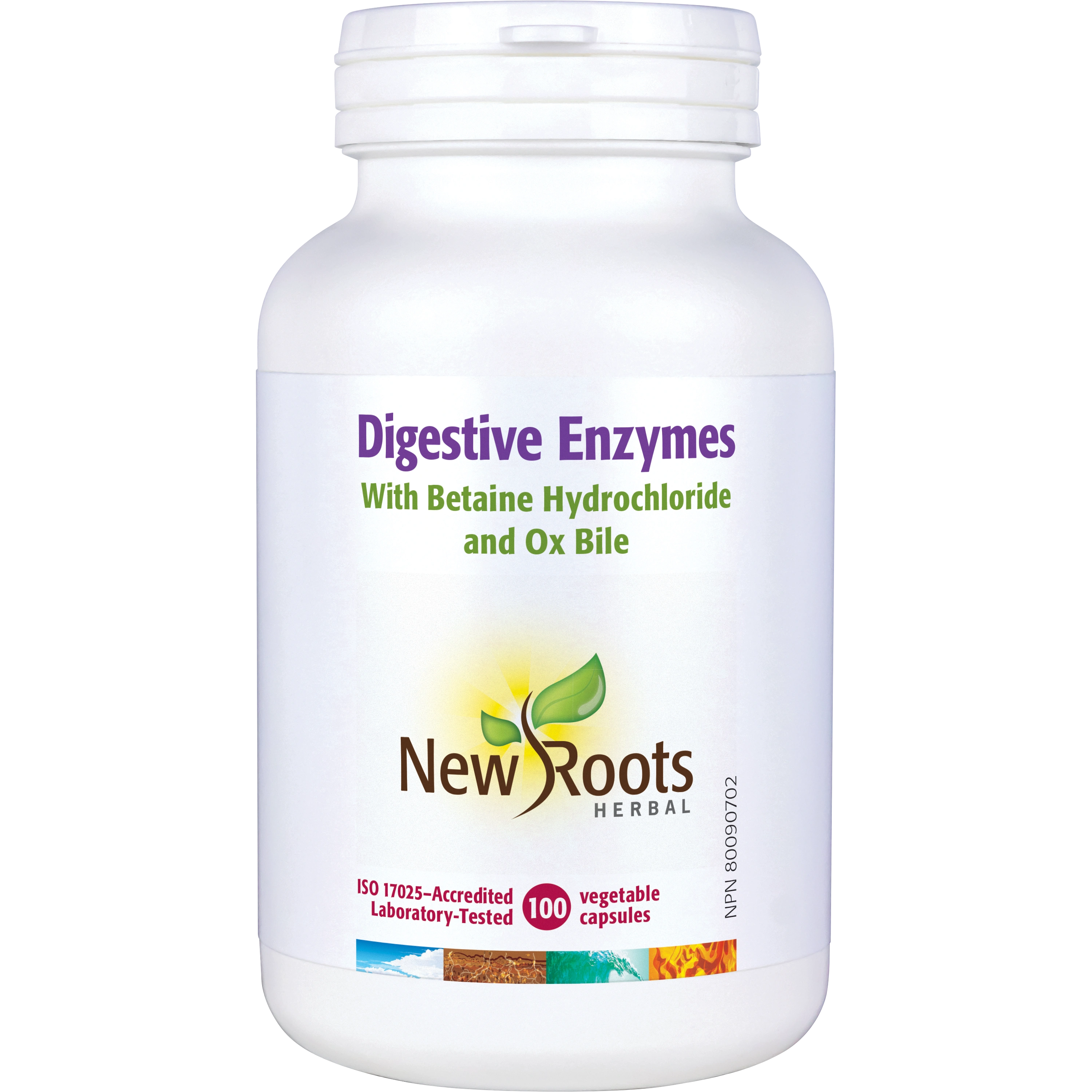 New Roots Herbal has two distinct formulas suitable for chronic digestive issues and occasional digestive challenges. Chronic digestive concerns can be simply age-related, with acute digestive distress often being as simple as indulging in holiday food that you may have an intolerance for. Digestive Enzymes is a potent formula made with both plant and animal ingredients. It contains betaine hydrochloride to arouse the digestive process within the stomach. A potent pancreatic extract delivers therapeutic amounts of protease, amylase, and lipase to drive digestion of proteins, carbohydrates, and fats, respectively. A 10:1 ox bile extract emulsifies (alters the surface area of) fats to ease absorption. Papain, sourced from papaya fruit, and the enzyme pepsin A further amplify protein digestion for ease of intestinal absorption. This broad-spectrum formula has a unique therapeutic niche for those seeking digestive relief.