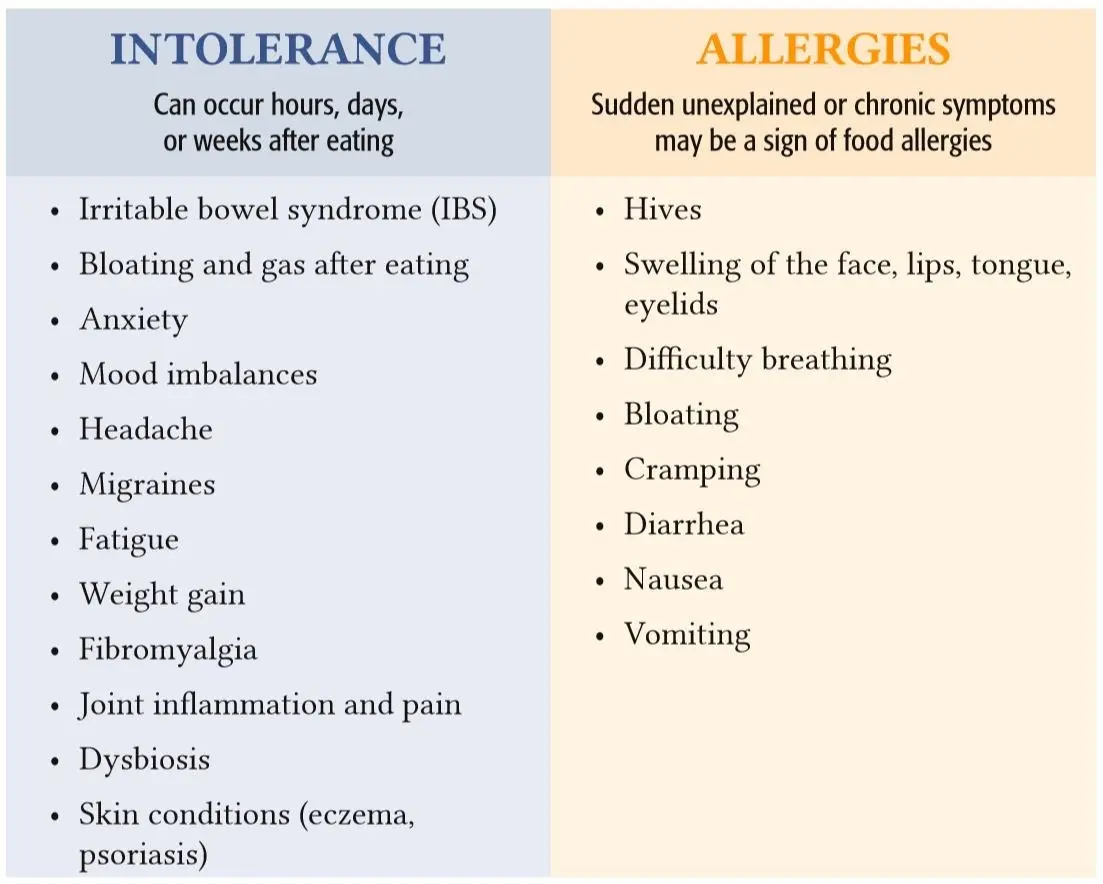 Allergic reactions involve an immune protein called IgE antibodies, while intolerances involve IgG antibodies. Whether you have an intolerance or allergy is difficult to judge by symptoms alone.