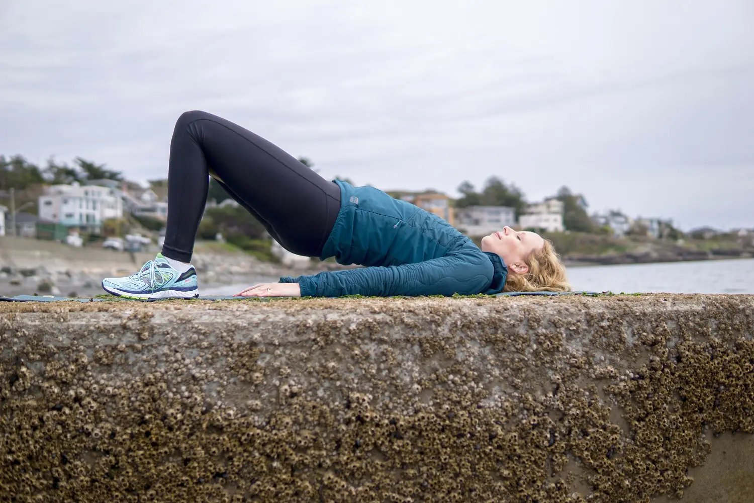 This yoga pose strengthens your glutes and opens your hips. Strong glutes stabilize your pelvis and knees, support your body when you are on one leg, and move your hips and thighs. Strong glutes also help to prevent many common runner’s injuries such as patellofemoral syndrome, IT band syndrome, and knee injuries. Hold for 10–30 breaths.