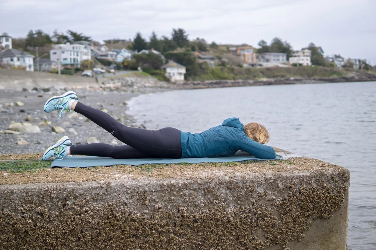 The hip extension combined with strong glutes in locust pose is the most important factor in your ability to run faster. It is hip extension that drives your leg backwards after your foot comes in contact with the ground. In this pose, think about extension more than lifting, and hold for 5–10 breaths on each side.