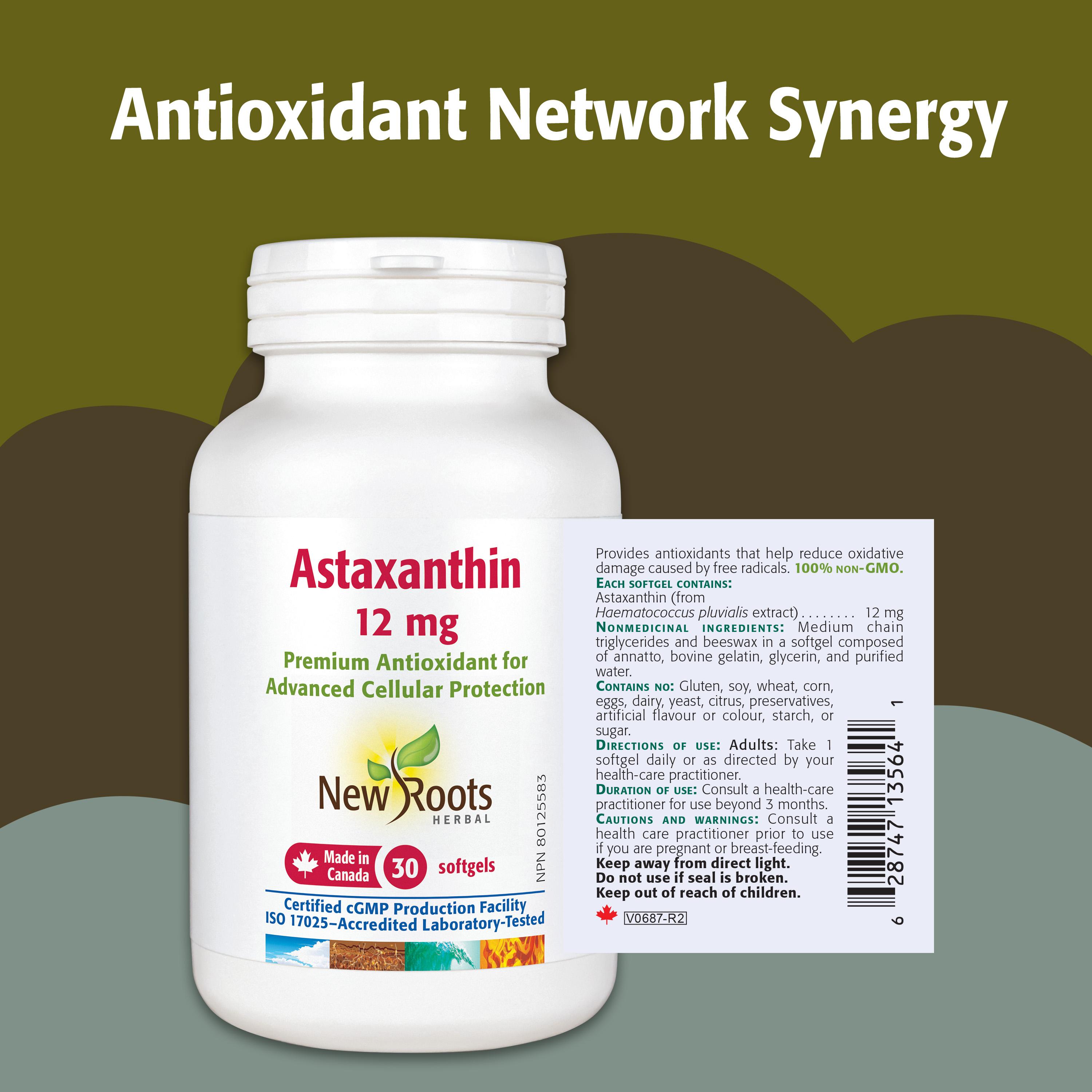 Astaxanthin is a naturally occurring red-orange carotenoid produced by the microalga Haematococcus pluvialisâthe same pigment that gives salmon, shrimp, and flamingos their vivid colour. As a fat-soluble carotenoid, it has been widely studied for how it fits into the bodyâs antioxidant network. It provides a protective phytonutrient that helps reduce oxidative damage caused by free radicals and works alongside other dietary antioxidants for broader support. Its long history in nature has made it a well-recognized and potent nutrient of interest. New Roots Herbalâs extract provides a concentrated, nonâGMO source of astaxanthin from Haematococcus pluvialis, rigorously tested in an ISO 17025âaccredited laboratory for safety, purity, and potencyâideal for those seeking strong daily antioxidant support from a natural carotenoid.