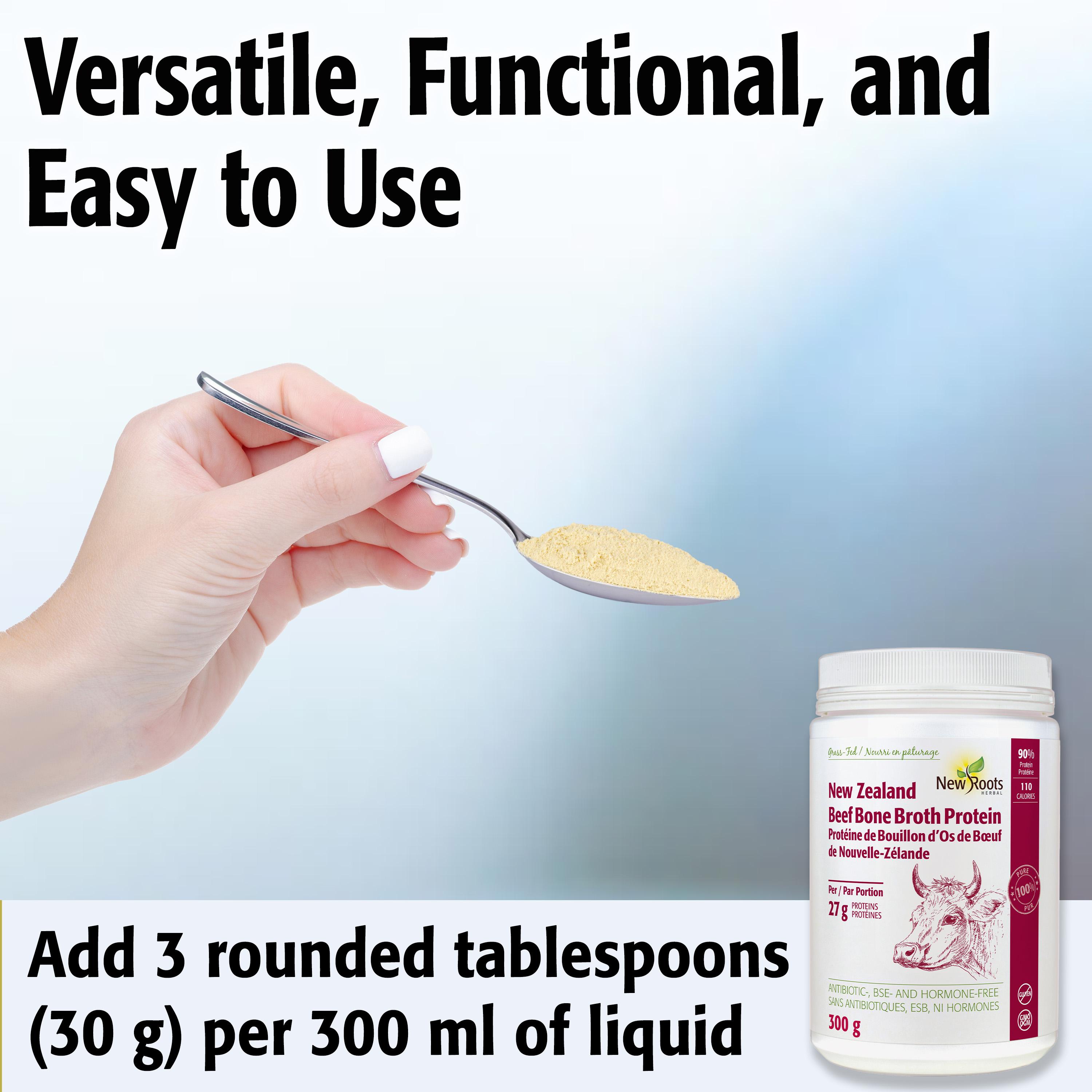 Pump up the protein content of soups, stews, and sauces; or serve it solo as a delicious bouillon “on-the-go.” For a broth: Add 3 rounded tablespoons (30 g) per 300 ml of hot water; if needed, add more water. Salt to taste. For recipe ideas, visit newrootsherbal.com/recipes.