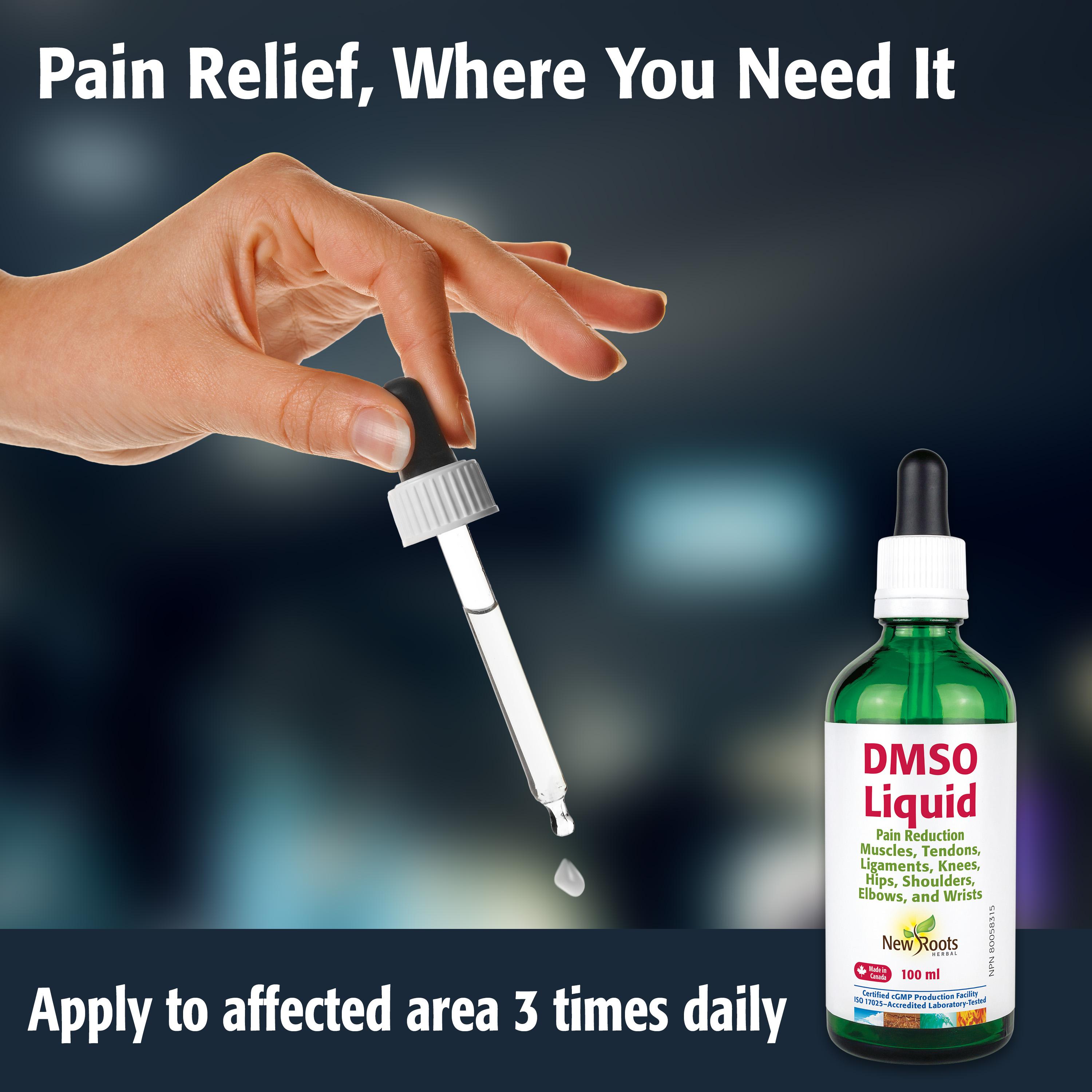 DMSO is applied topically and quickly penetrates the skin, entering the bloodstream to target the tissues where pain and inflammation occur. Its effects are felt within minutes, offering temporary relief that typically lasts for a few hours. DMSO is metabolized and cleared from the body within 12–24 hours, without being stored or accumulating.