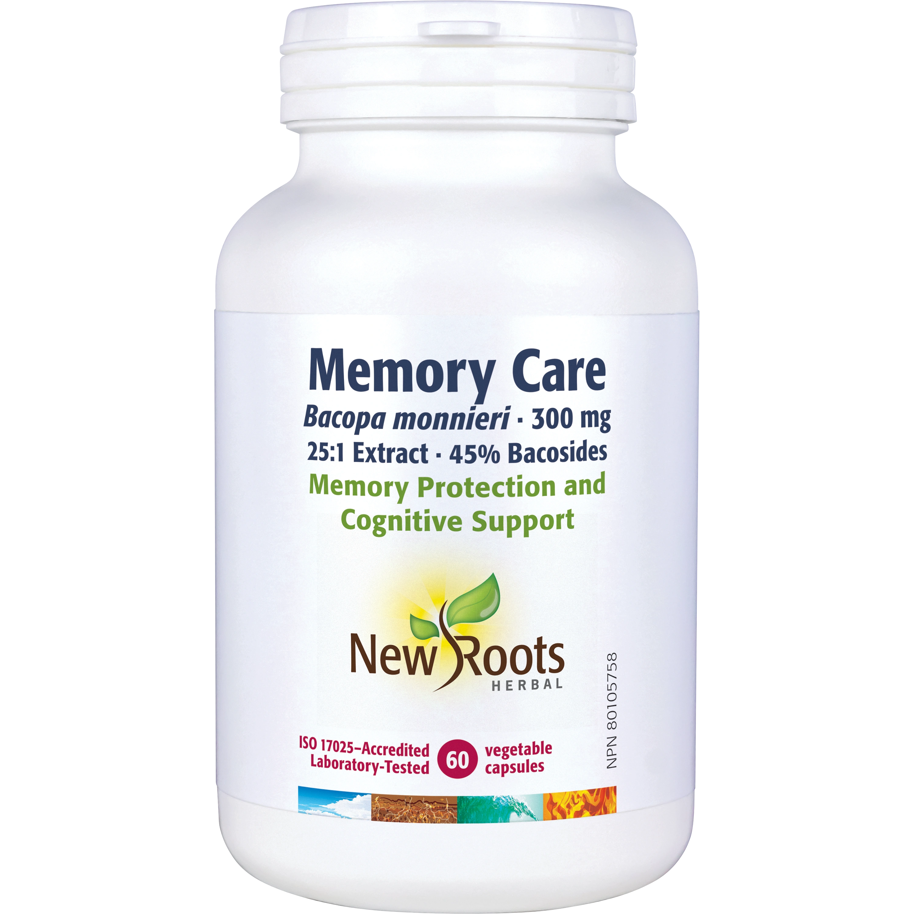 Memory Care features 300 mg of potency-validated Bacopa monnieri extract. This 25:1 standardized extract provides 45% of active bacosides. These compounds help modulate signalling pathways between brain cells.